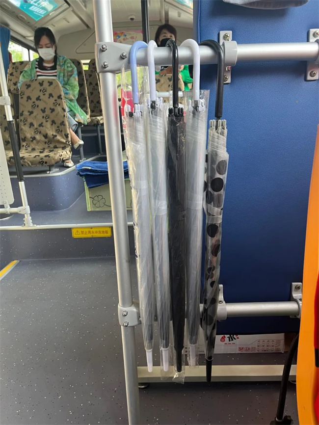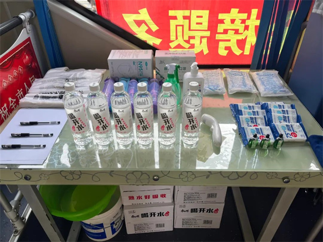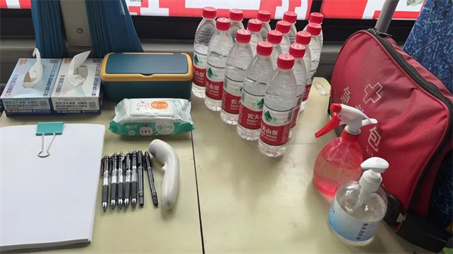 車內雨傘、礦泉水、消毒液、消毒濕巾、口罩等一應俱全,車身上還懸掛有“高考愛心服務車 217路為您服務”等字樣的條幅,這是張玲為了參與愛心助力高考活動,提前精心布置的車輛。