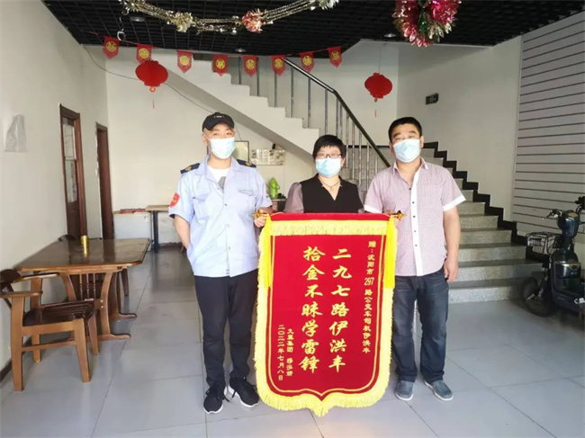 8月25日下午,市民薛英山懷著感激的心情給211、222路車隊送來了一面錦旗,上面寫著“助人為樂大公無私 拾金不昧品德高尚”的字樣,他以這樣的方式表達著對211、222路車隊和駕駛員溫偉的感謝之意。