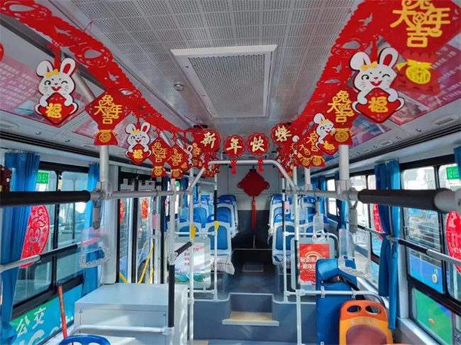 在209路車隊,車廂、站務室、辦公區域處處洋溢著喜慶的中國風,生肖窗花張貼在車窗兩側,可愛的卡通兔“微笑”著向乘客們送著“祝福”,“新年快樂”的拉花昭示著中華民族的傳統佳節即將到來。