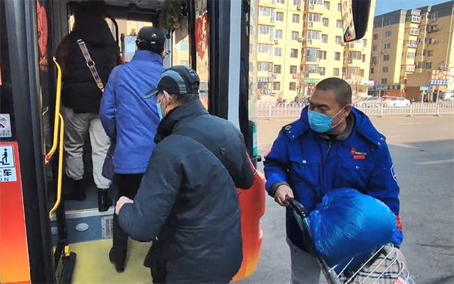 趙殿喜對老人說:“258路就到生日城,我這準備發車了,大娘您坐我車吧!”
