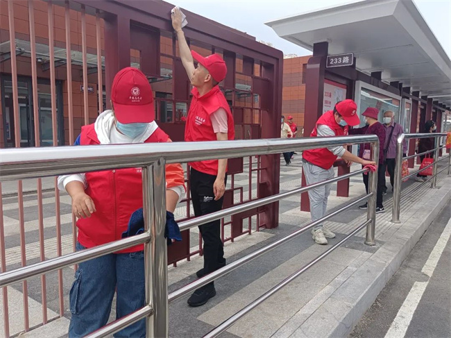 活動中,志愿者們身穿紅馬甲、頭戴小紅帽,手中拿著抹布、清潔刷、水桶等清潔工具,對樞紐站內的候車廊、站臺等進行集中大清掃。