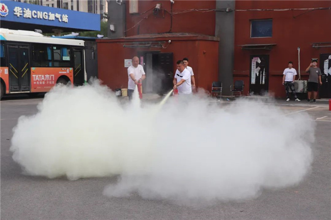 培訓結束后,大家來到通運公司院內,由李教官為大家進行消防、反恐方面的指導,并模擬公交車輛突發(fā)火災事故時,駕駛員應如何采取緊急停車、開啟車門、切斷電源、疏散乘客到安全位置等應急措施,以及如何正確使用滅火器進行滅火的實操演練。