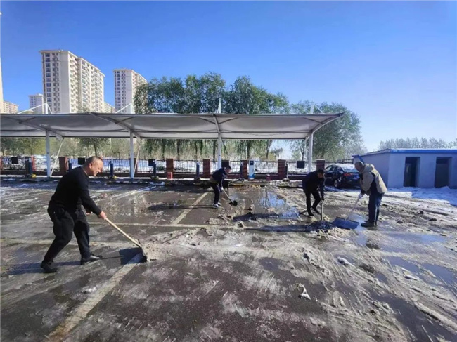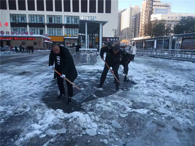 清掃公交樞紐站積雪,保障車輛安全進出站。