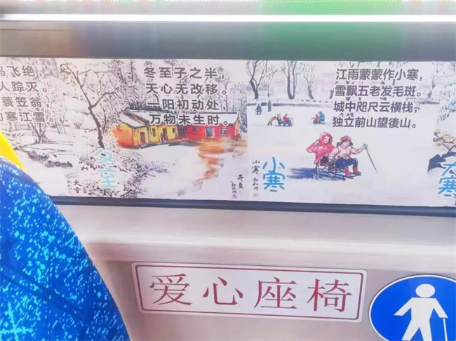 據方堃介紹,除了給乘客提供座墊套的服務外,她還通過上網搜集24節氣常識和詩句,在車廂內的座位附近張貼了24節氣的相關詩句,方便乘客了解民風民俗,弘揚傳統文化,這些常識類的詩句很受一些帶孩子乘車的家長和孩子們的歡迎。