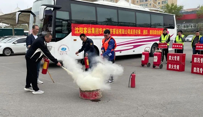培訓結束后,在場人員來到戶外停車場開展綜合應急演練。本次演練模擬了乘客攜帶不明液體乘車時駕駛員或安全員的例行檢查,乘客與駕駛員發生爭執時危險舉動的處置方法,車內自燃時駕駛員疏散乘客下車的方式及正確使用滅火器的方法和注意事項。