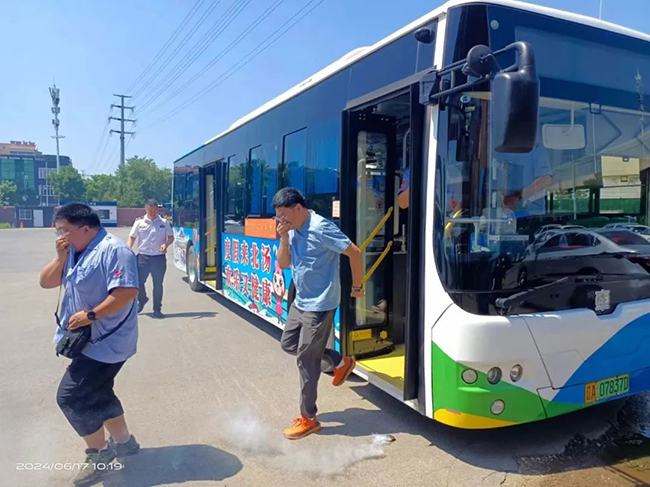 會議結束后,黃教官與大家一同來到演練場模擬演習公交車自燃時的逃生技巧和處置方法。