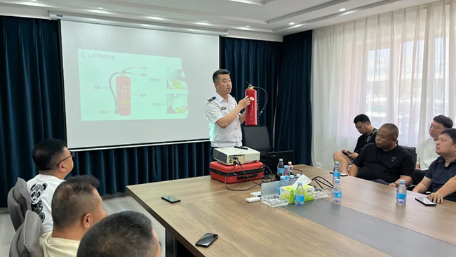 會議室內,黃教官通過課件和實操相結合的形式,用一件件真實發生的案例向大家講解了各類火災的特點與應對方法,以及遇到汛情及臺風時的處理辦法等,并通過“提、拔、握、壓”四字口訣教會大家如何正確使用滅火器。