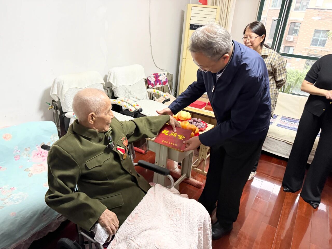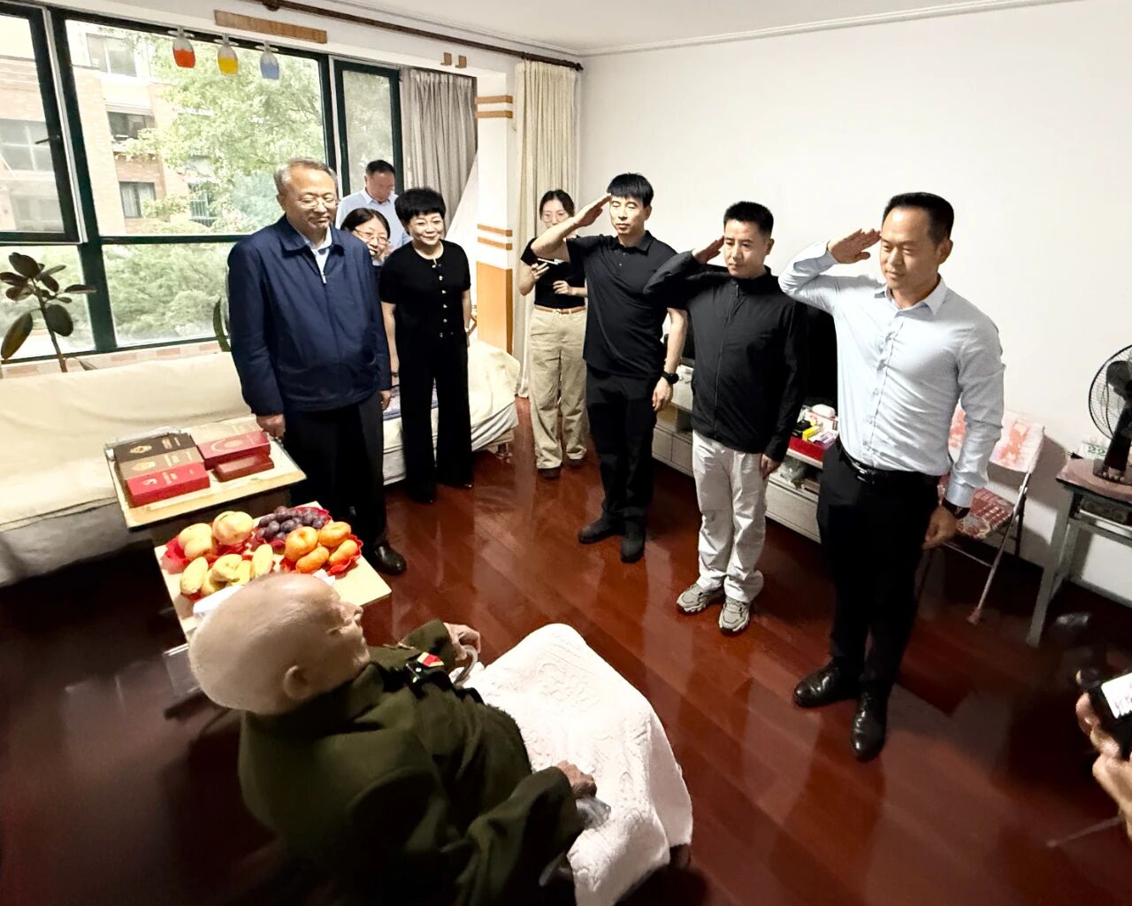 慰問(wèn)過(guò)程中,韓宗森老同志與家人深情回顧了當(dāng)年的革命歷程,特別是抗戰(zhàn)時(shí)期的崢嶸歲月和英勇事跡。現(xiàn)場(chǎng)氣氛熱烈,韓老還和大家一起高唱《中國(guó)人民志愿軍戰(zhàn)歌》。雖已年過(guò)九旬,他依然思維敏捷、聲音洪亮、精神矍鑠。在場(chǎng)的工作人員和退役軍人無(wú)不為之動(dòng)容,自發(fā)地向韓老行莊嚴(yán)的軍禮,表達(dá)由衷的敬意。