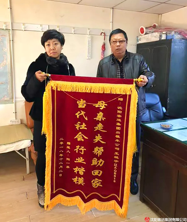 12月6日,走失老人家屬將一面寫有“母親走失幫助回家 當代社會行業楷?!钡腻\旗送到公司,公司才了解王艷宇所做的善舉。